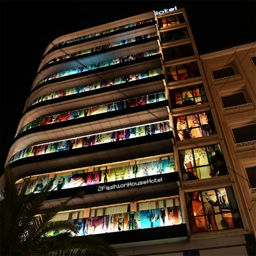 Imaginée pour le 2FashionHouseHotel d’Athènes, cette installation artistique pérenne vient habiller et illuminer la façade d’une sélection de clichés de mode retravaillés graphiquement à l’aide de couleurs saturées.