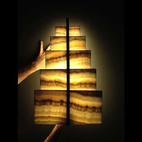 I was commissioned to create and design a permanent light art installation on the facade of the 52nd Street building by the owner and developer who transform this hotel in private luxury apartments and offices. A vertical light stripe as a vein in the centre of the building, settled from its top to almost bottom, will softly light its surroundings, each night. A warm and peaceful light will appear and disappear as if the building was breathing, in a quiet mood, opposite of the urban restless rhythm. Inspired from this installation and the architectural shape of the building, we have imagined a wall-lamp refining the lines & shapes and replacing glass with onyx or white marble. Especially designed for these Luxury flats, the Element of Light, called “52th”, plays with the translucence of the “crystal” luxurious stones.