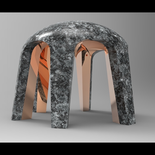 L’architecture défensive des bunkers m’a toujours fasciné… Inspirée de ces formes spécifiques, j’ai dessiné une lampe aux contours massifs. Puis, j’ai voulu opposer ces lignes « brutes » au raffinement du marbre et à la chaleur du cuivre. Creusée, j’y ai vu les enfants, toujours au sol, ou cherchant sécurité et rêveries lorsqu’ils sont sous les tables ou sous les lits… Finalement, j’ai imaginé cet Élément de Lumière comme un soleil intérieur, seulement visible depuis le