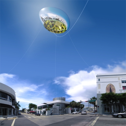 Considered as points of entry (and way out), the four Cardinal Crystal Eggs would have been posted at each crossroad, as a symbol of creativity and a twisted vision inside the heart of the district. Moving along with the wind, pedestrians walking under them would have discovered a concave shaped diamond from beneath. Inhabited by many reflections, each egg would have given the impression that light was born in the heart of the balloon.