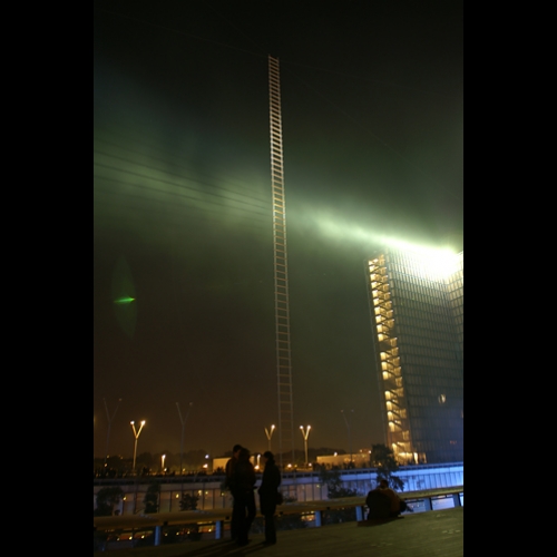 In order to symbolise this elevation I imagined a “Jacob’s Ladder” that would climb towards the sky, suspended over the forest that grows in the centre of the BNF. Joining the earth with the Sky, the angels use Jacob’s Ladder to move up and down. Enlightened by two beams of light symbolising the pace of the angels, the ladder drew an infinite vertical line.