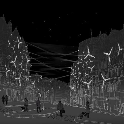 « Under the leadership of Swarovski and a few members of the Knightsbridge Association, representing Harvey Nichols, Mandarin Oriental and WA Ellis, I was asked to work on a custom light installation for the Knightsbridge neighbourhood for the festive season. In order to create an enlightened, fairy scenery for visitors and pedestrians alike, I envisioned fixing a grid of threads above Knightsbridge’s Crossing onto which I would attach “crystal kites” that would fly with the wind or “sparkling clouds” composed of thousands of minute crystals. Along the facades of the prestigious road, I imagined creating glittering “windmills” : while the metallic heads of small-sized windmills would spin in the air, their “wings” covered in translucent, pastel tinted crystals would seam to float in the air. A dreamscape. »