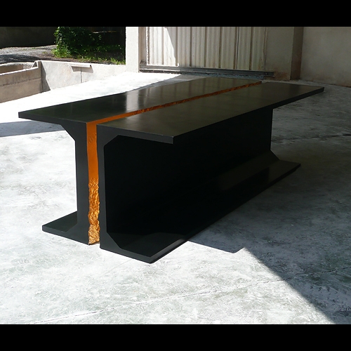 Table en aluminium patiné, scindée en deux sur toute sa longueur, comme déchirée d’or.