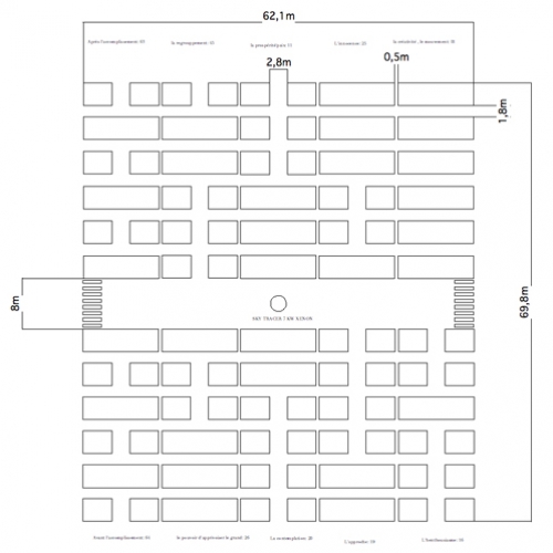 Once at the top of the mountain, visitors discover an accumulation of mirrored panels positioned in the shape of a labyrinth. With four cardinal entries, the installation stages bi-coloured mirrors that create a symbolic progression towards light : finding their way amidst panels recreating the constitutive elements of the I Ching, all happens as though visitors were deciphering symbols of the Korean culture. Step y step, each visitor (re)discovers his own image while he paces through the labyrinth towards its centre, where he reaches a vertical beam of light. Directed towards the sky, the beam can be seen from the heart of the city. A symbolic installation.