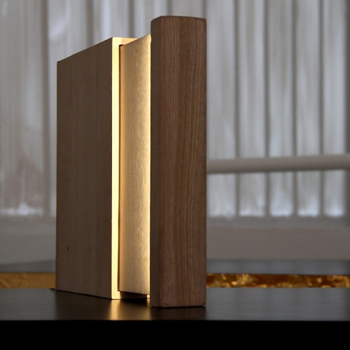 Cachée entre les livres, la lampe « Light book » s’ouvre comme un livre enfermé dans un précieux coffret. Présence discrète, la lumière se révèle quand on tire le livre de son écrin. Le bois, matière première du support du livre, devient lampe. Entièrement réalisée en bois de cèdre, une fine ligne de LED est dissimulée dans l’élément vertical qui s’ouvre et se referme pour contrôler manuellement la lumière. L’aura lumineuse qui en sort, est ainsi régulée par le degré d’ouverture. L’odeur du cèdre se mêle à l’odeur des livres, ne laissant plus, une fois la lampe fermée, que le souvenir de la lumière.