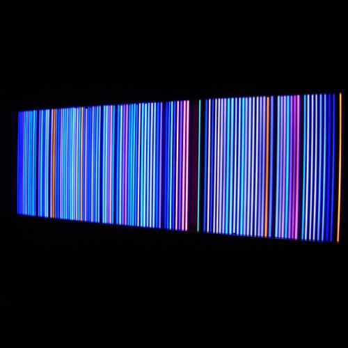 Composed of two large horizontal metallic boxes, which face each other, the first is torn numerous times from top to bottom in a chaotic way : through those tears, different tints of light come through ranging from light pink to lavender blue. Enclosed with a window pane, the second one welcomes a series of neon tubes separated by gap that are linked to non-revealed words, like a visual Braille. Enlivened with lavender, light pink, sky blue and amber hues, the tubes represent the colours of the Parisian sky in the eyes of one who has left.. as if a Parisian sunset over the Seine had poised inside the space. As if light remained captive inside the peristyle.