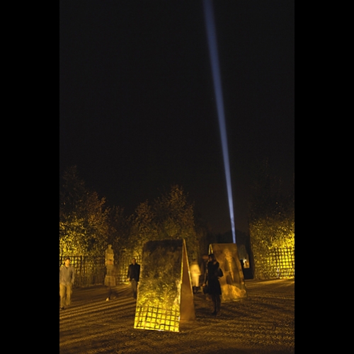 Le but de cette installation était de travailler sur un effet de miroir entre les bosquets de la Girandole et du Dauphin. Le premier était habité de miroirs bicolores qui, à la tombée de la nuit, campaient de nombreux reflets, comme des cadres fixes, décalés. Au cœur du bosquet, un faisceau s’élever vers le ciel. Une voix narrative s’élevait : elle parlait d’intimité, de création, d’abandon. Figuration des mots.