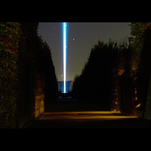 The goal of this installation was to created a mirrored link in between the identical ‘bosquets’ inside which the symbolic spirit of elevation was “drawn” by two vertical light beam directed towards the Sky. In the first labyrinth, mirrors staged numerous reflections like misplaced fixed frames. A narrative voice spoke about intimacy, creativity and abandonment. A moment to reflect on oneself.