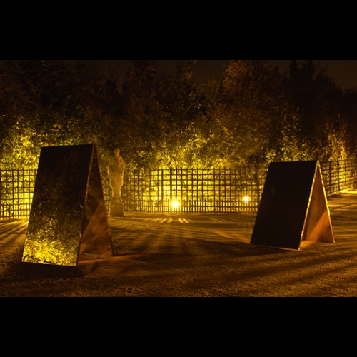 The goal of this installation was to created a mirrored link in between the identical ‘bosquets’ inside which the symbolic spirit of elevation was “drawn” by two vertical light beam directed towards the Sky. In the first labyrinth, mirrors staged numerous reflections like misplaced fixed frames. A narrative voice spoke about intimacy, creativity and abandonment. A moment to reflect on oneself.