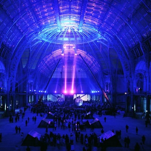 Si les sculptures monumentales sont puissamment éclairées en contre jour, la verrière s’habille de vagues lumineuses successives. Un cycle lumineux, doux et apaisant, qui permet au visiteur de glisser de l’éblouissement à la rêverie. Une vision poétique et vibrante du majestueux bâtiment. À l’intérieur, les miroirs amplifient la dimension vertigineuse de cette chorégraphie nocturne.