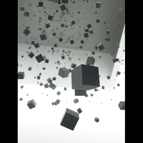 « This cloud-like installation evolves into a suspended moment in time : poised, it seems to hold its breath before vibrating anew. Combining speed of light and inertia, the accumulation of cube resembles a static explosion.