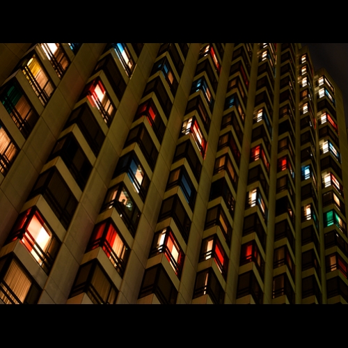 At night, as one opened or closed the curtains, turned off or on the lights, the façade came to life with a luminous set of colourful movements. »
