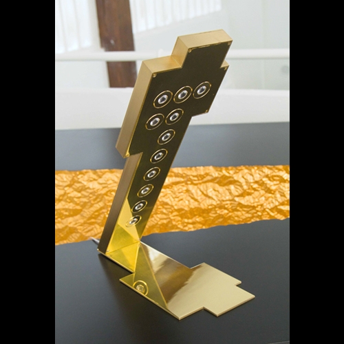 suspension, either table lamp. Made of brass, with two sorts of LED and two different angles of light, narrow and wide, turning on one axe, bend on 90 °, it had been designed in seven shapes to never touch in the eyes of the pedestrian, and to be able to change the light of the shop easily. Thierry Dreyfus chooses to have the light coming from the clothes and the accessories displays and designed this series of exclusive golden brass lamps reflecting the visitors and the clothes as in mirrors.