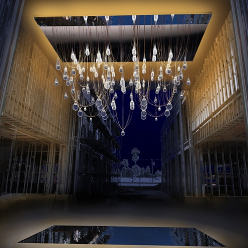 Limited edition suspension commissioned by a Scottsdale collector and entrepreneur, this dramatic outdoor chandelier was created as a fluid and masculine interpretation of classical chandeliers. Considering light as a fluid vibration, it is built without any solid structure, thus revealing its secrets when reflected into a mirror or glossy painted floor. Looking like an elegant puzzle of entangled ropes (made out of woven hemp) that float and bounce back with the movement of the wind, the eyes always question its shape. Moreover, by adding crystals to the piece (as the core luminous elements), the warm texture of traditional candlelight and fire is transformed into a clean and vibrating constellation of lights.