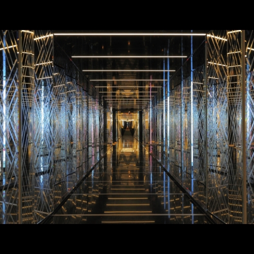 entrance hall : The goal is that this hall way seems dark when you come inside it, with dome kind of light leak on the ceiling and the floor ; not only dark but also mysterious by its hyper glossy feeling.