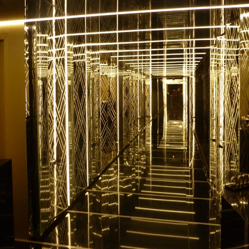 entrance hall : The goal is that this hall way seems dark when you come inside it, with dome kind of light leak on the ceiling and the floor ; not only dark but also mysterious by its hyper glossy feeling.