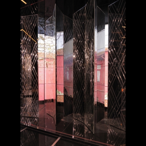Then, as soon you walk in this hallway, your penetrate between the "walls", these one turns all together, both side together, exactly coordinated, unexpected, and make discovered strong light coming from two screens hidden behind them. These screens diffuse films, either natural images either music clips, either inside of Turkish iconic land mark spaces. This light will attract the pedestrian, and surprise him/her, but will disappear when the triangle will close again. Each of the 3 sides of the triangle have a different treatment, meaning that the two walls could be either simply white, either mirrored, silver or dark mirror, either iridescent treatment/crystals. The walls are never mixed texture ; they are all the same, on each side.
